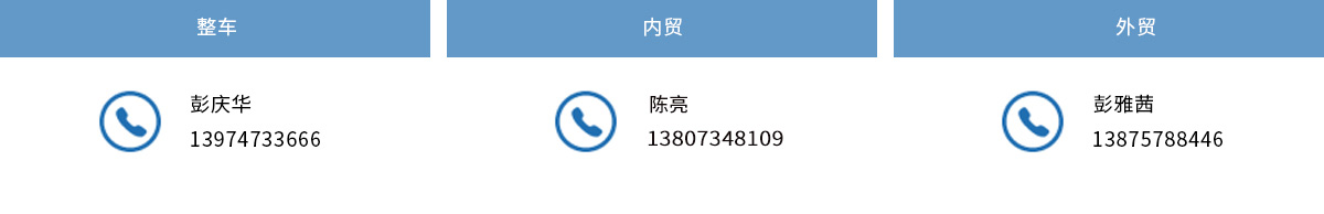 整車 聯(lián)系人:彭先生 電話:13974733666 內貿 聯(lián)系人:陳先生 電話:13807348109 外貿 聯(lián)系人:彭女士 電話:13875788446